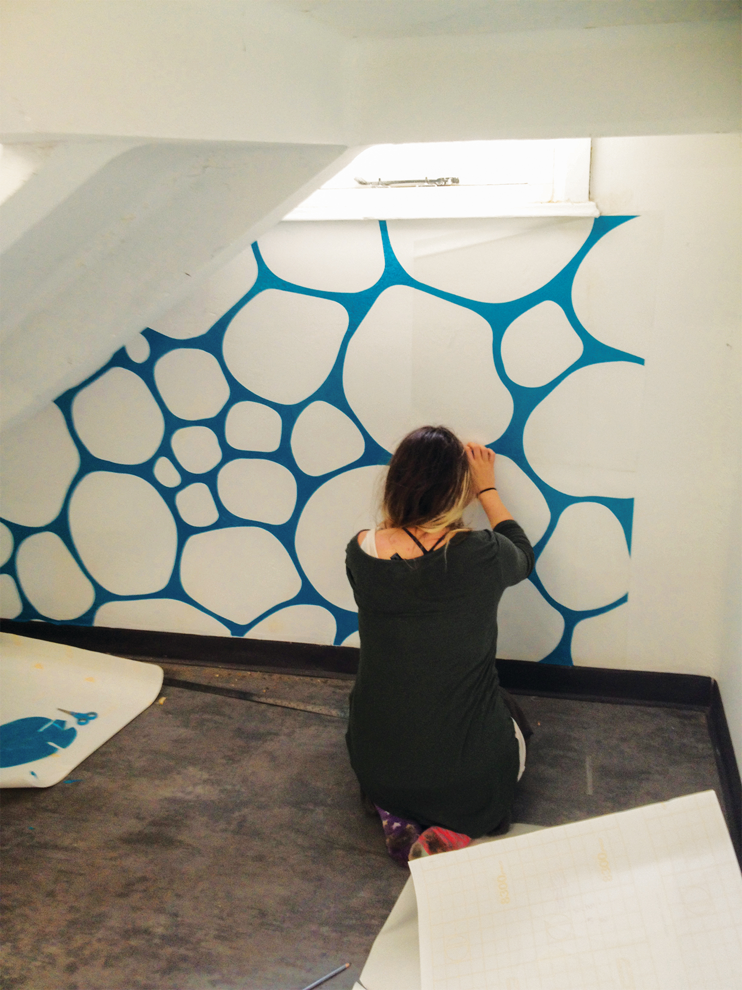 Due to the results from my studies I went on to install this pattern at a large scale, within a busy passageway in the university. Using vinyl and a flat bed cutter I was able to cover around 27 metres of wall space to create this piece that has already begun to have a positive effect on it’s surroundings.
