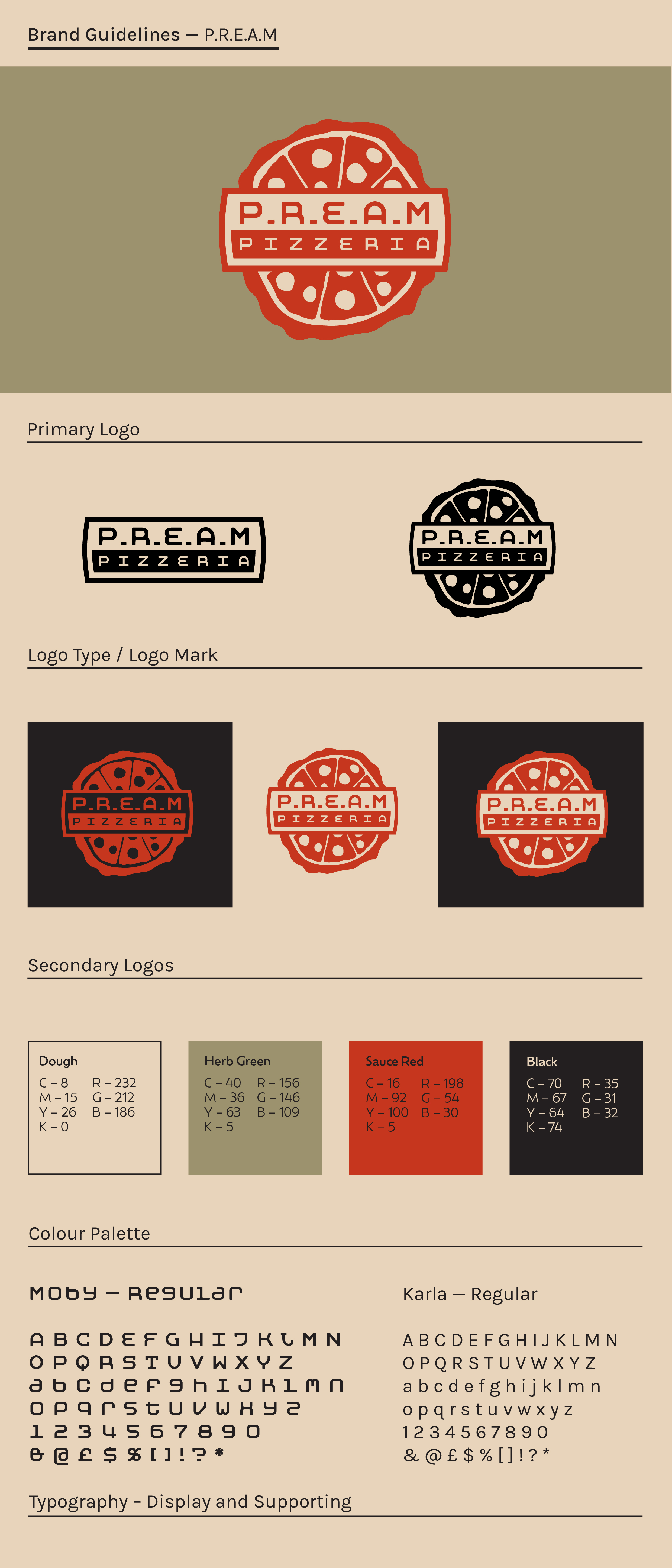 Brand DesignSheffield based Pizza Truck P.R.E.A.M started in 2023 and needed some sweet branding to help them stand out in the potentially competitive market. Owner and entrepreneur Fabio is a long time lover of all things Hip Hop so couldn’t resist the urge to name the company in honour of a classic Wu Tang Clan Song ‘CREAM’. PREAM stands for ‘Pizza Rules Everything Around Me’.