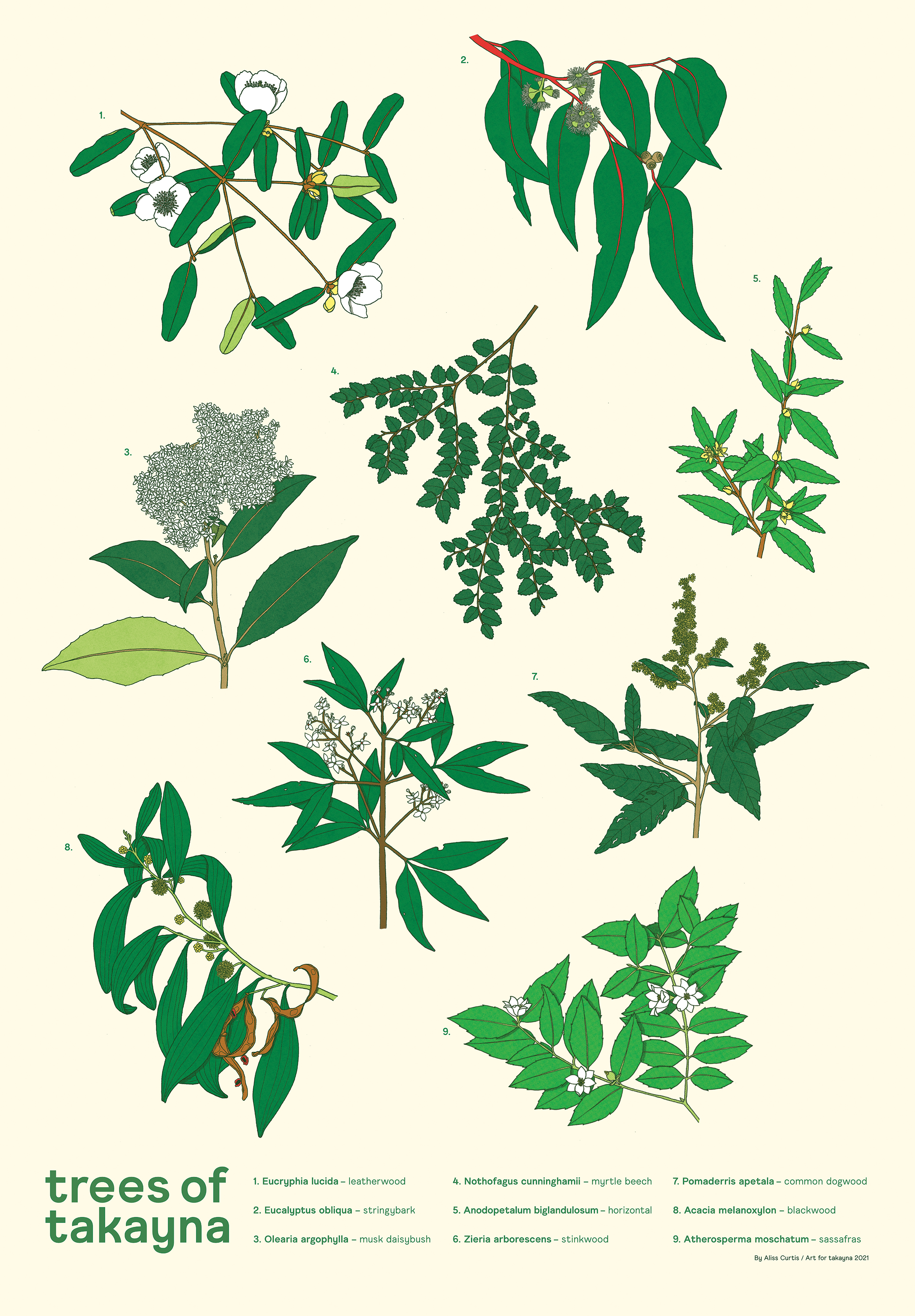 Botanical Illustration, Art PrintMy outcome for ‘Art for takayna’ 2021 was this ID poster, designed for learning and loving some common tree species found in takayna/the Tarkine. These were available for purchase at the exhibition in Hobart at The Long Gallery, where proceeds went to support the defence of takayna through the hard work of The Bob Brown Foundation. I also had a hand in the organisation and set up of this exhibition.